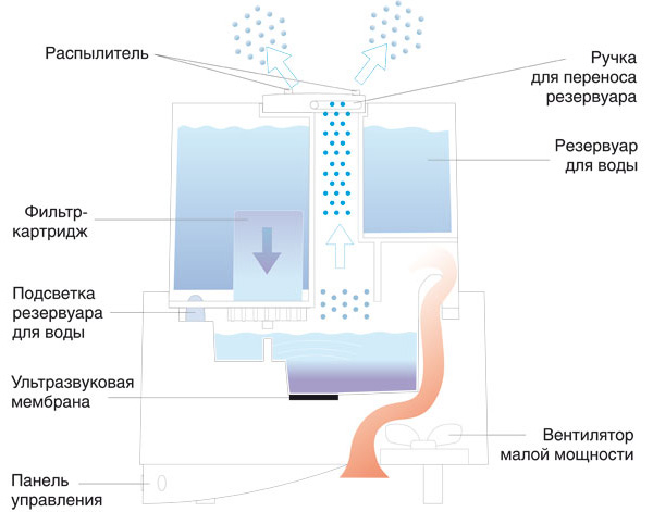 Ce type d'humidificateur est une sorte de générateur de brouillard. A l'intérieur se trouve une plaque vibrante très rapide (avec la fréquence des ultrasons). Depuis le réservoir d'eau, l'eau pénètre dans l'assiette, se transformant en de nombreuses petites éclaboussures d'eau. La conception comprend également un ventilateur. Il conduit l'air sec de la pièce à travers ces sprays, ce qui permet d'humidifier la pièce de manière uniforme.