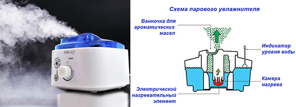 L'humidificateur à vapeur est plus simple. Par le principe d'action, il ressemble à une théière.Les électrodes sont abaissées dans un récipient d'eau, qui fait bouillir le liquide. La vapeur chaude sort dans des trous spéciaux et remplit l'air de la pièce de gouttes d'humidité. Pour vous protéger et protéger les enfants des brûlures, vous devez placer l'appareil à au moins 10 cm de la zone d'accès