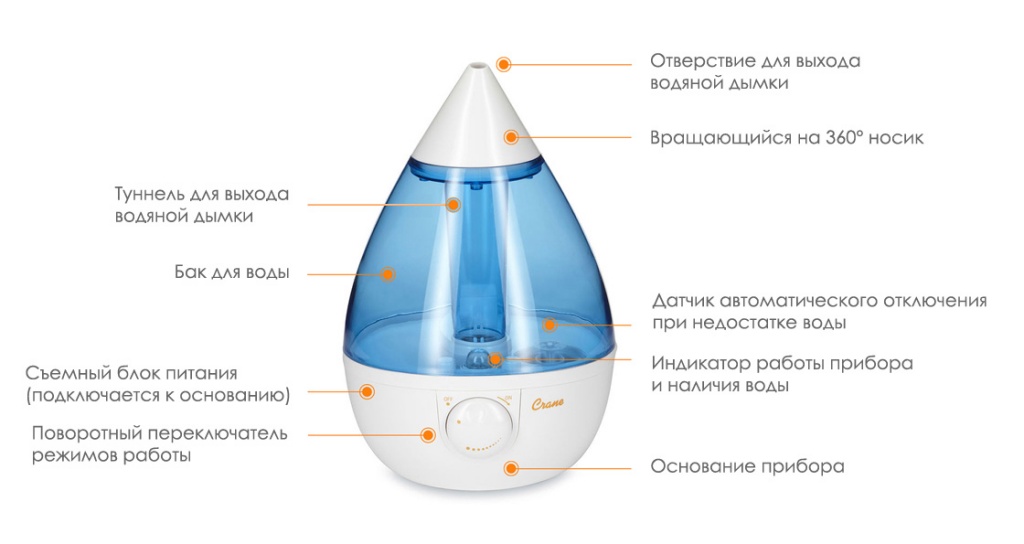 2. Ventilateur, élément chauffant ou module à ultrasons - dispositifs qui accélèrent l'évaporation de l'humidité du réservoir et la transfèrent dans l'air sous forme de suspension.