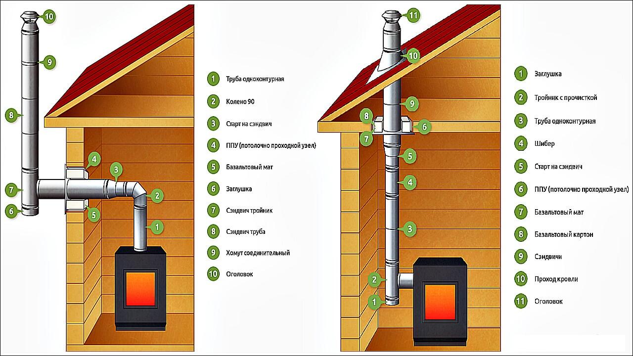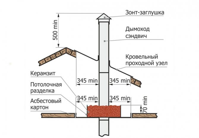 Il est très important de faire passer correctement la cheminée à travers le plafond. Après tout, le plus souvent en raison d'une installation incorrecte à cet endroit, des incendies se produisent dans les bains.