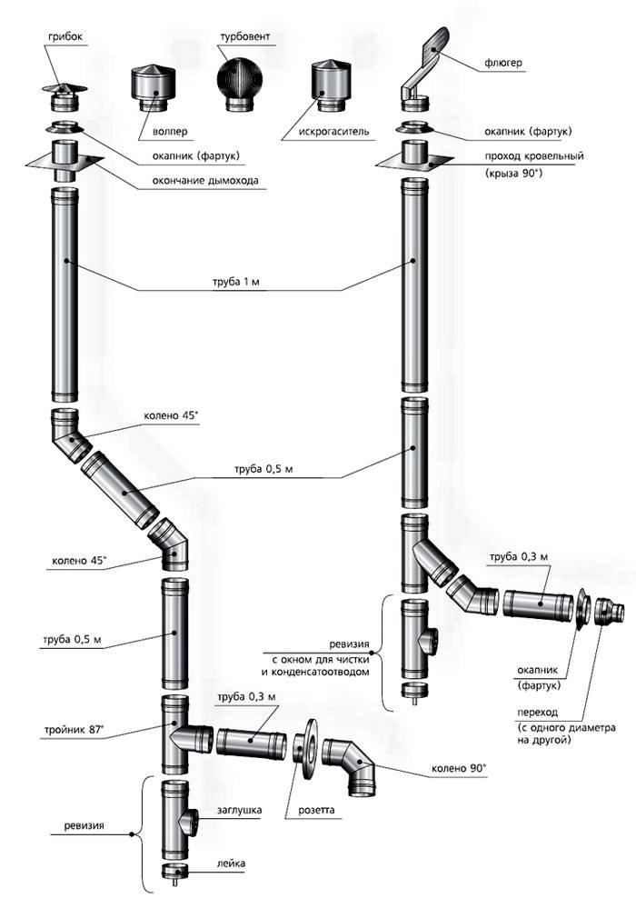 En règle générale, ces cheminées sont disponibles dans des longueurs de 0,35 à 1 m, selon le fabricant. La connexion des tuyaux intérieur et extérieur se fait au moyen d'un verrou, qui est un amincissement de la taille externe d'une extrémité et une expansion du tuyau intérieur de l'autre côté.