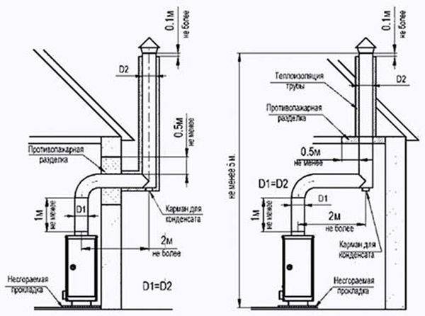 Le diamètre de la cheminée est choisi en fonction de l'équipement de chauffage utilisé. Lors de l'installation de la chaudière, celle-ci est déjà réglée par le fabricant avec un tuyau de vidange. Il est interdit d'y connecter des tuyaux d'une section plus petite, et il n'est tout simplement pas nécessaire d'en connecter un plus grand. Dans le second cas, pour augmenter la traction, vous devrez monter une boîte de vitesses, ce qui coûte très cher.