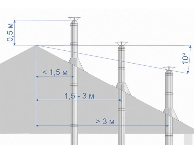 Les normes réglementent la hauteur du tuyau par rapport au faîte du toit, en fonction de la distance entre eux