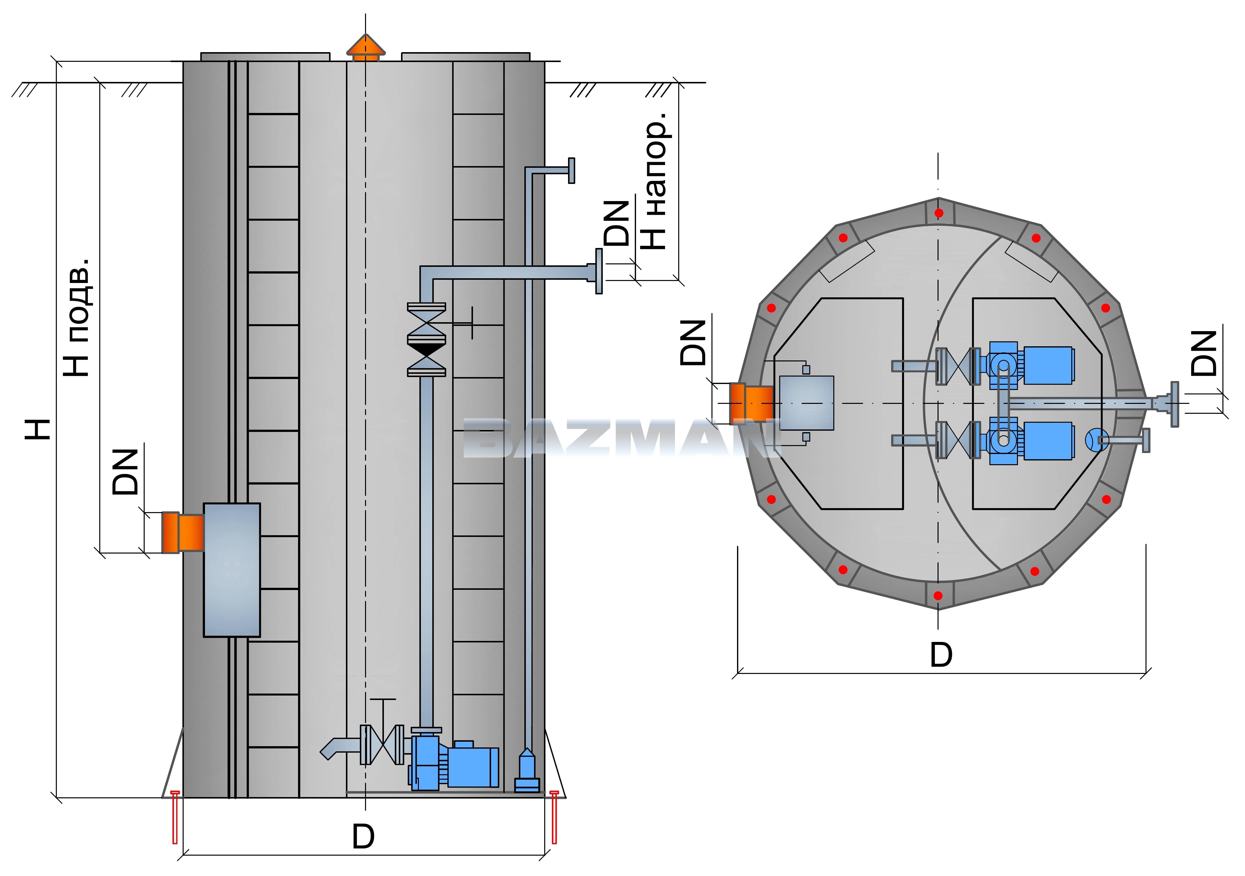 KNS peut avoir exécution verticale et horizontale. Ces derniers sont souvent équipés d'une pompe auto-amorçante, qui pompe de force les masses contaminées dans le boîtier KNS et les élimine après le nettoyage. Parfois, un réservoir peut avoir un compartiment horizontal supplémentaire sur le fond. Cette conception contribue à la répartition uniforme du limon dépôts au fond réservoir et augmente le temps de son remplissage.