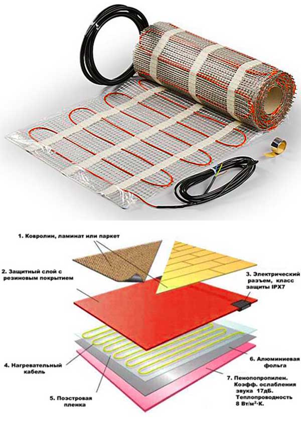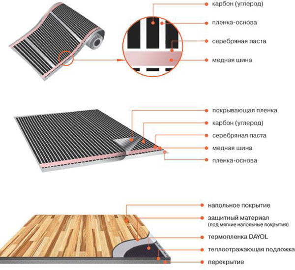 Le matériau isolant est une substance à base de polyester et de polyéthylène. Le composant principal du produit est l'élément chauffant, composé de fibres de carbone et de polymères. Le câble utilisé à ces fins est en cuivre. Sa section est de 2,5 mm. Il est isolé par une gaine jusqu'à 3 mm d'épaisseur.