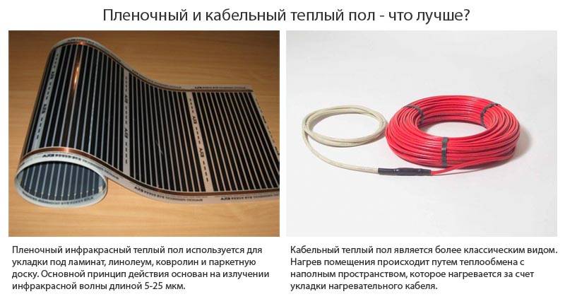 Les deux options de câble et de film sont un chauffage au sol électrique.Les options présentées peuvent être comparées en termes de consommation d'énergie, d'efficacité et de fiabilité des équipements. L'avantage des radiateurs infrarouges dans ce cas est une consommation d'énergie moindre, aucune perte d'énergie pour le chauffage de la chape. Mais il faut également tenir compte du fait que la chape sert également à protéger les équipements électriques d'éventuels dommages mécaniques.