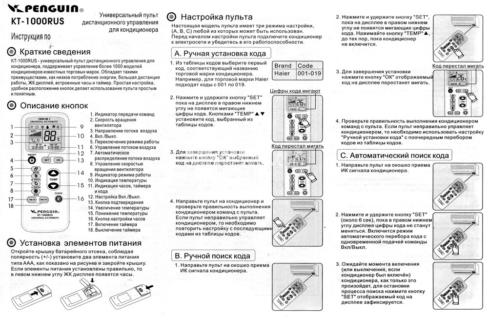 Quel que soit le modèle, tous les appareils universels sont configurés selon le même principe qui consiste à entrer le code nécessaire dans la mémoire de la télécommande. Idéalement, une instruction avec un tableau de codes pour différents modèles d'équipements climatiques est jointe à la télécommande. La télécommande est configurée en deux modes - automatique et manuel.