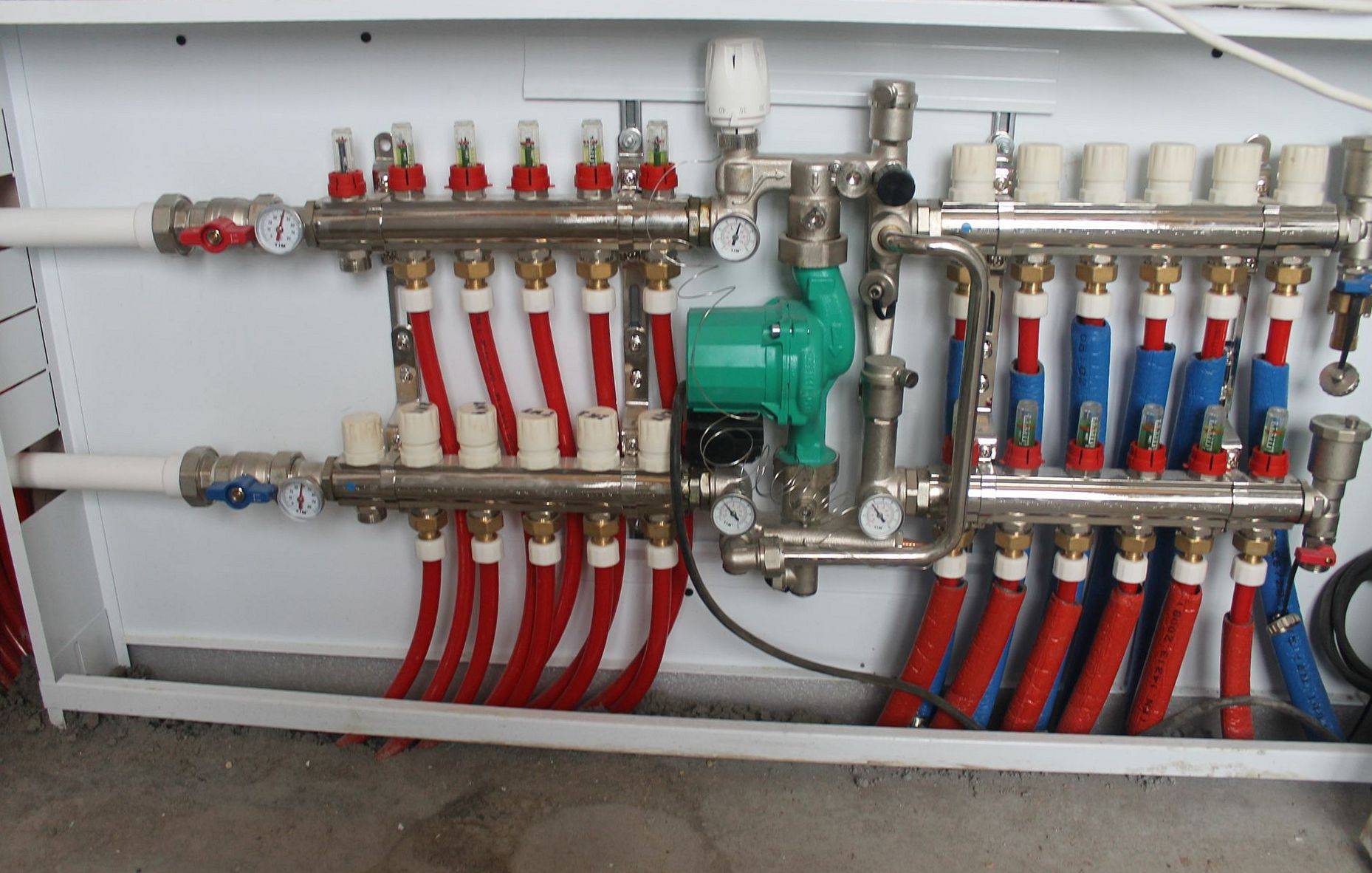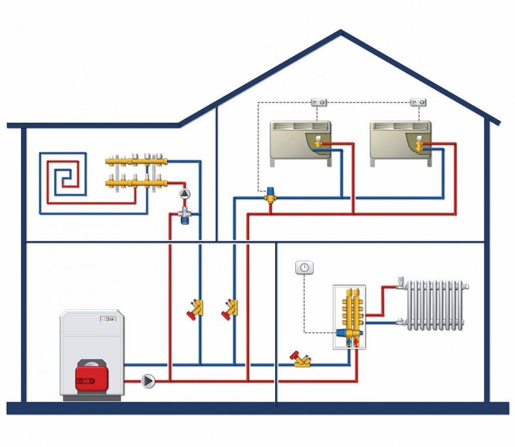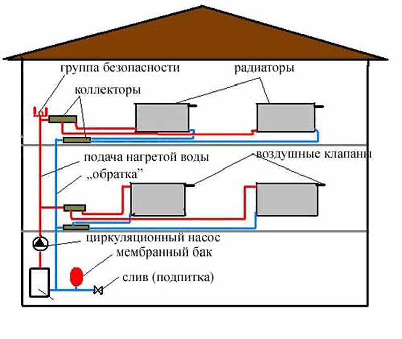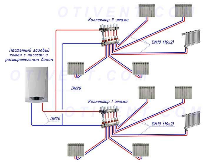 Le schéma de chauffage collecteur traditionnel d'une maison à deux étages comprend des nœuds de distribution aux premier et deuxième niveaux. Mais tout dépend de la superficie totale des locaux et, par conséquent, de la longueur des autoroutes individuelles.