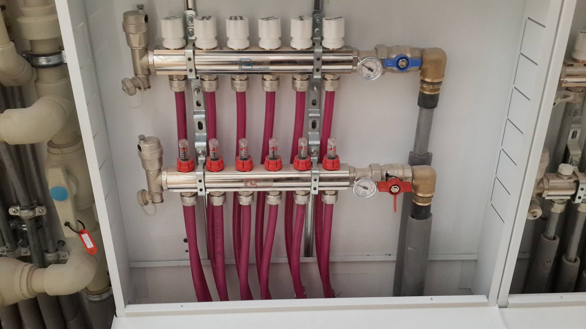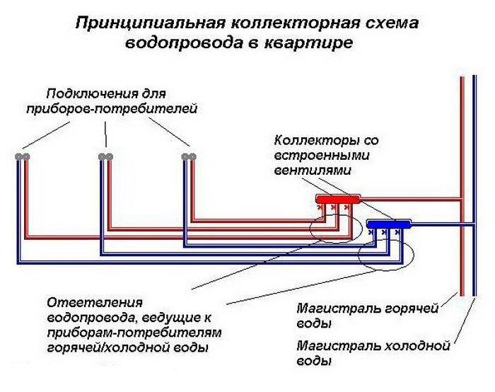 Câblage du collecteur. Ce système présente des avantages évidents par rapport au système en T. Une vanne d'arrêt est installée à l'entrée de l'alimentation en eau de l'appartement. La différence est que chaque appareil a un tuyau séparé. Dans ce cas, toutes les vannes sont concentrées en un seul endroit.