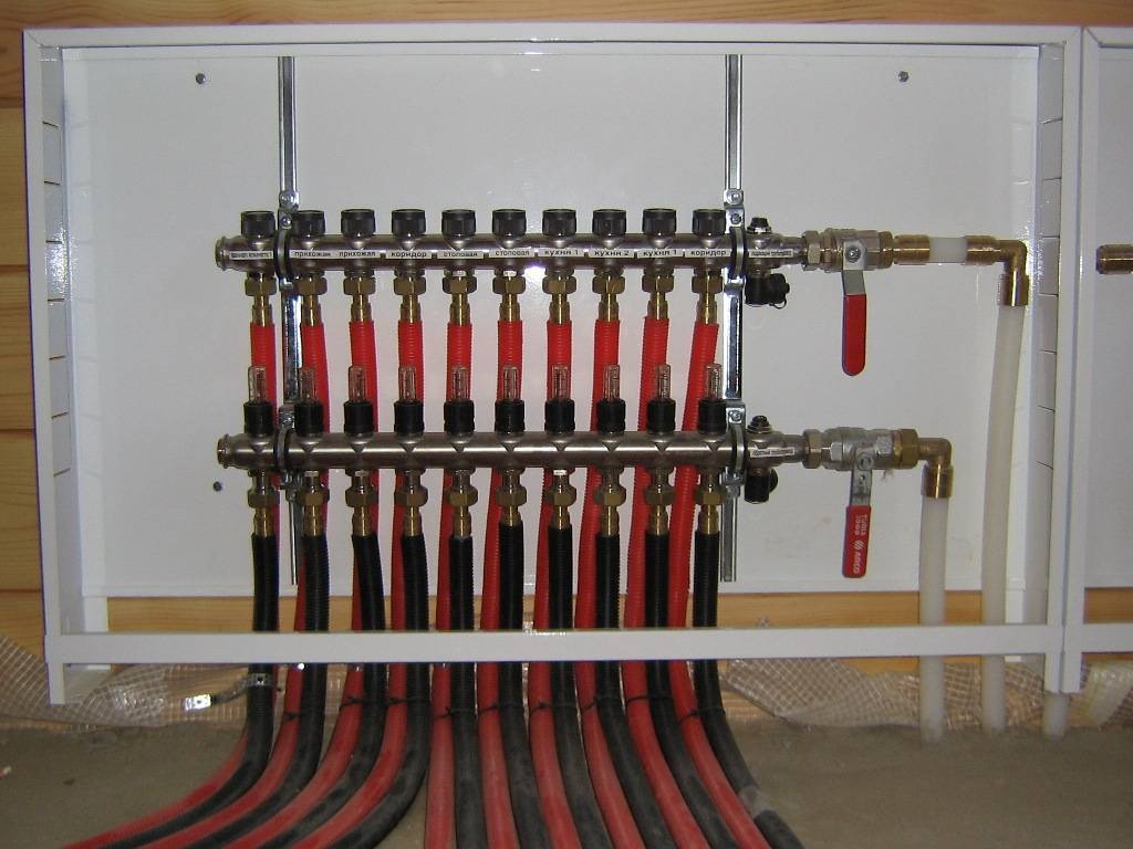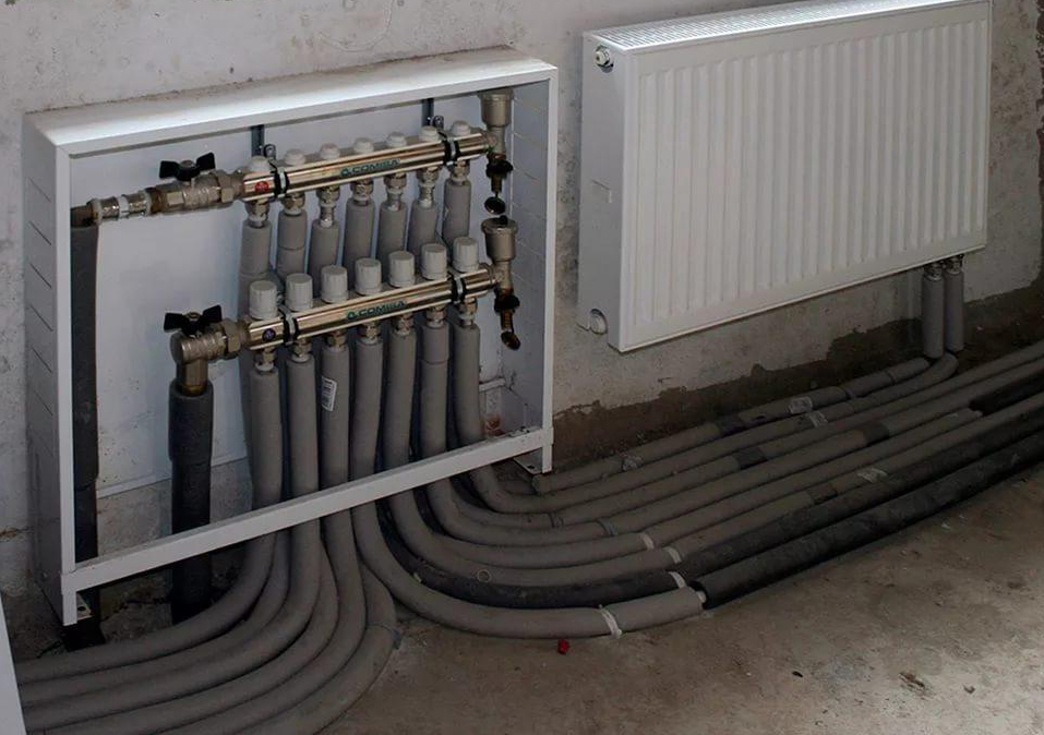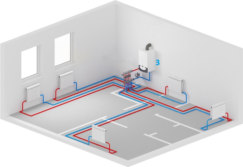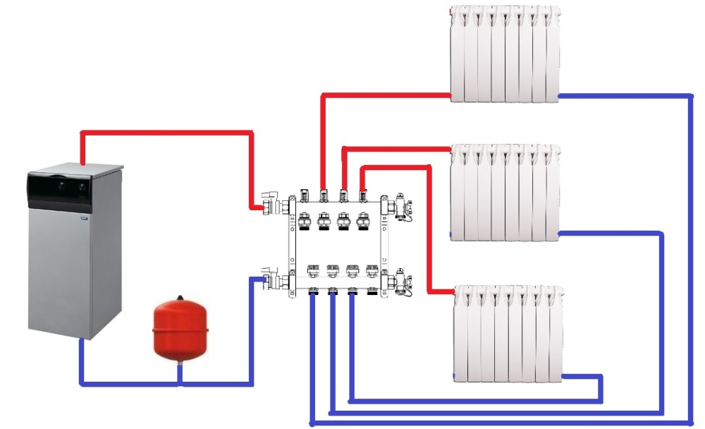 Le système de faisceau collecteur prévoit l'installation d'un collecteur à travers lequel le liquide de refroidissement est distribué dans tout le système. Chaque batterie de chauffage a ses propres tuyaux pour fournir le caloporteur et son évacuation directement de la chaudière. Chaque circuit est coupé par des vannes d'arrêt. Cela rend le système plus facile à utiliser et à réparer. Sans éteindre l'ensemble du système, vous pouvez réparer un circuit ou un radiateur séparé.