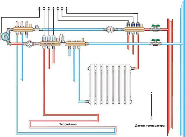 - Dans les schémas de faisceaux de radiateurs, les mêmes peignes de systèmes de chauffage par le sol sont utilisés, mais avec des fonctionnalités réduites. Nous expliquerons la différence ci-dessous.