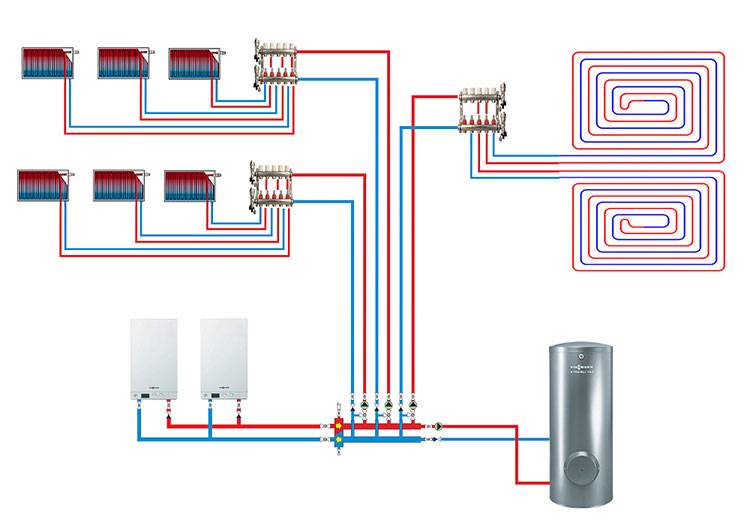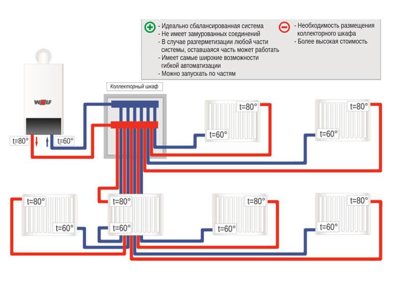 Le calcul des paramètres, le dessin, la régulation de puissance pendant l'utilisation sont facilités par la connexion de radiateurs en parallèle. Cela garantit une différence minimale de température de l'eau autour du périmètre du circuit. Le système est contrôlé à partir d'un seul endroit avec des indicateurs, des robinets, des pompes et des vannes installés.