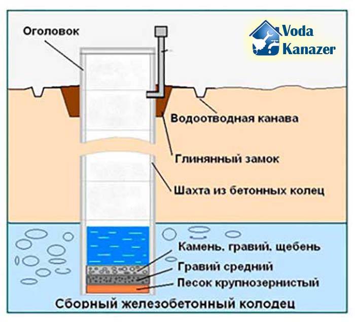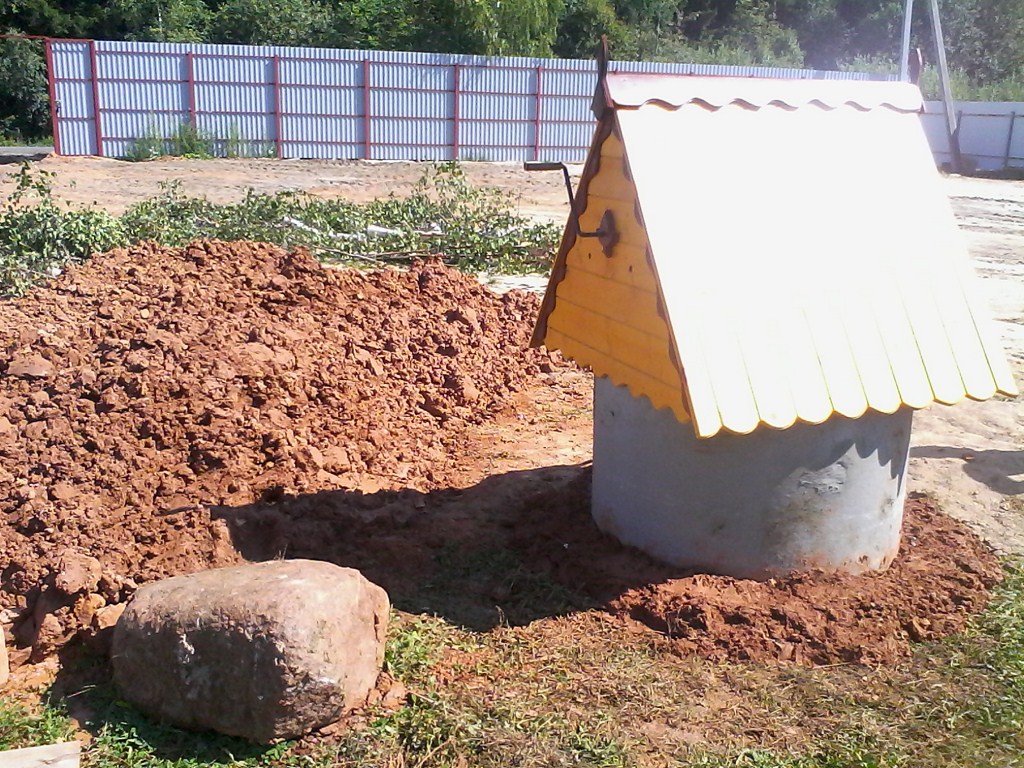La technique d'excavation est la même ici : tant que la profondeur le permet, elle est simplement jetée à la pelle. Ensuite, ils ont mis un trépied et une porte et l'ont soulevé dans des seaux. Après avoir installé les anneaux, l'espace entre les parois de l'arbre et l'anneau est rempli et percuté. Dans ce cas, les plusieurs anneaux supérieurs peuvent être scellés de l'extérieur (avec une imprégnation bitumineuse, par exemple, ou avec un autre revêtement imperméabilisant).