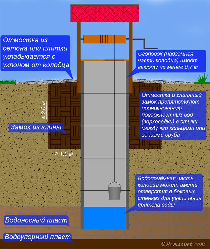 - La densité de remblai de l'interstice entre la paroi du puits et les anneaux reste inférieure à celle du sol "natif". En conséquence, l'eau de fonte et de pluie s'infiltrera vers l'intérieur, où elle pénétrera à l'intérieur par les fissures. Pour éviter cela, un cercle de protection en matériau imperméable (membrane d'étanchéité) est réalisé autour du puits avec une pente à partir des parois du puits.