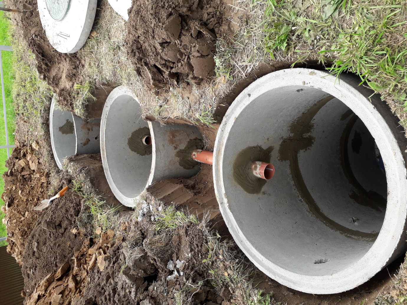 - A l'emplacement du futur puits, nous procédons à un marquage de manière à ce que le diamètre du puits dépasse de 10 cm le diamètre des anneaux en béton utilisés. Le trou est creusé à une profondeur qui permet au premier anneau de ne pas s'enfoncer complètement. 8-10 cm doivent rester au-dessus du sol;