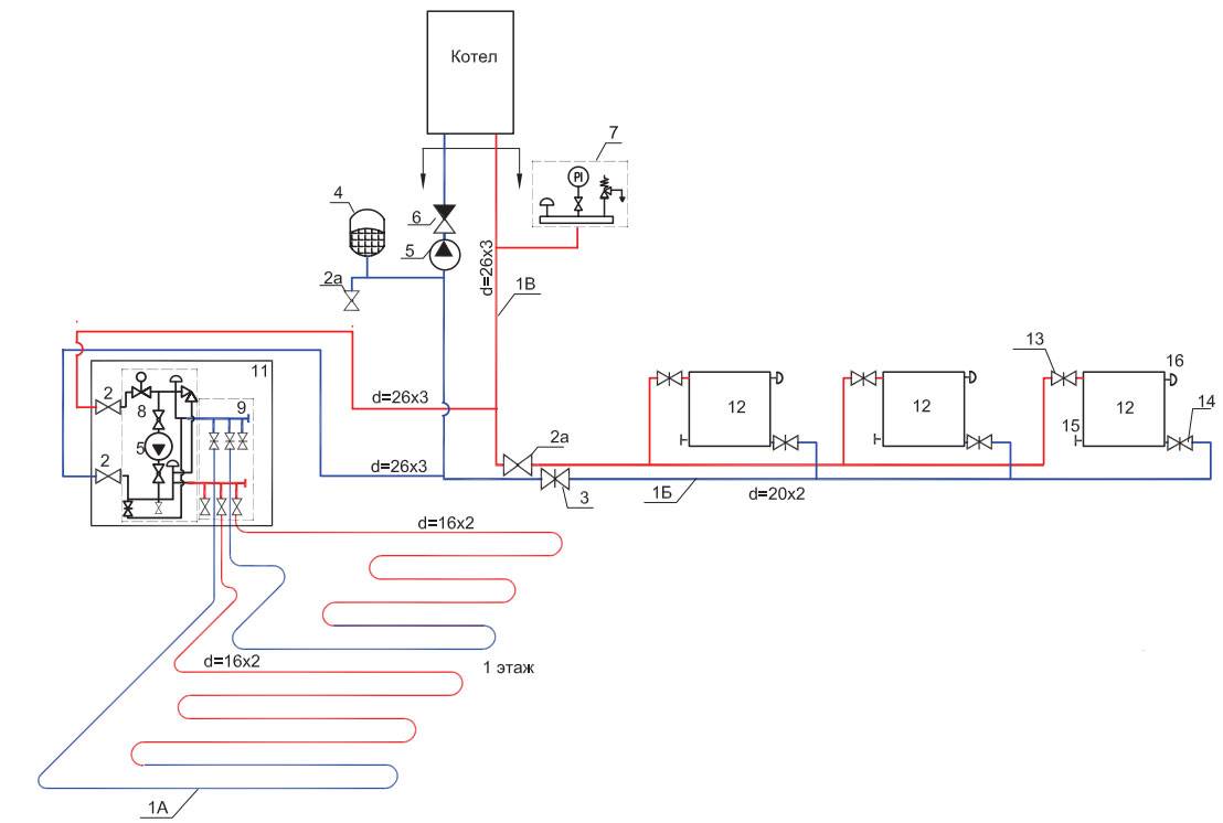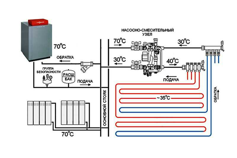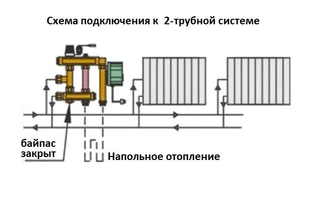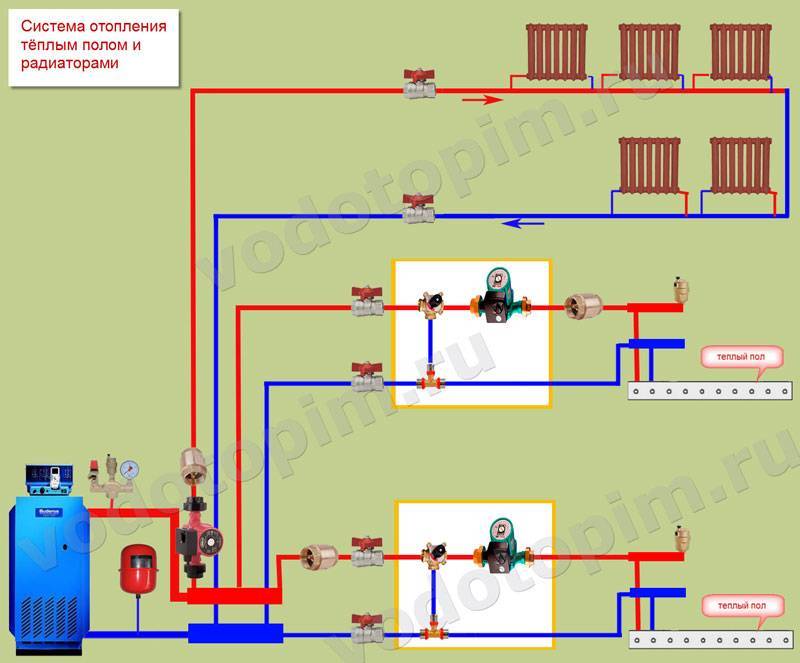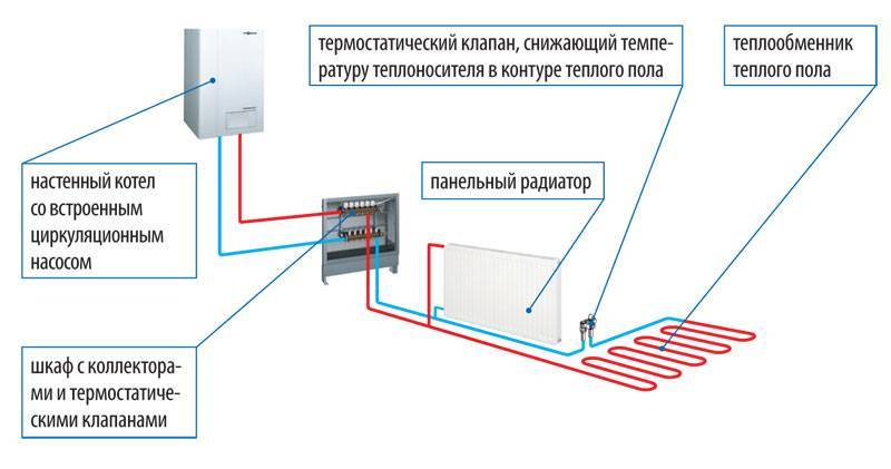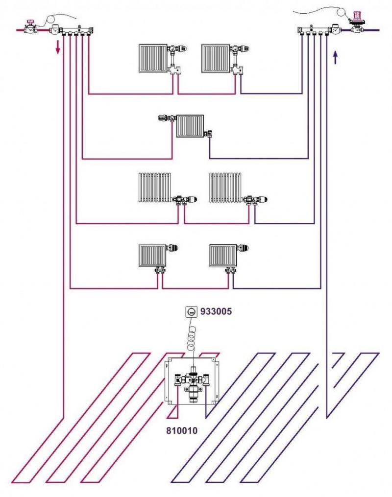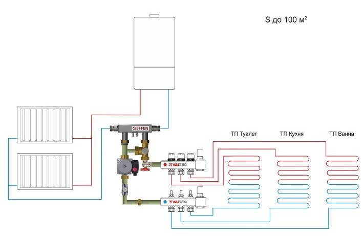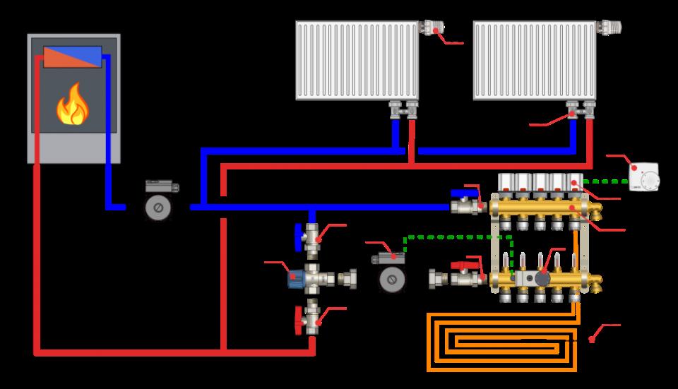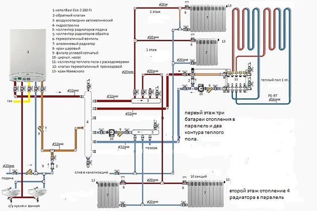 Mais cela est résolu en connectant différents circuits en un seul. Pour cela, deux circuits, il s'agit d'un radiateur et d'un plancher, sont amenés sur un même circuit colonne montante ou chaudière. Et puis le problème est résolu.
