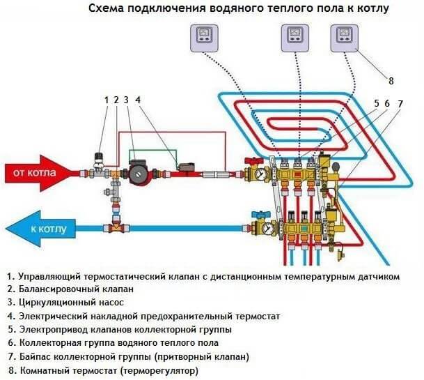 Schéma-exemple de connexion d'un plancher chauffé à l'eau.