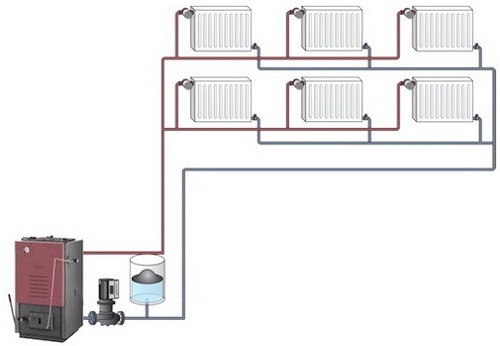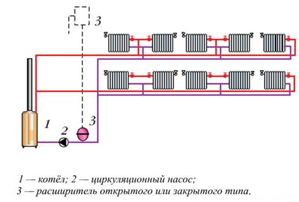 Contrairement au schéma ci-dessus, pour la circulation forcée, il n'est pas nécessaire de faire une colonne montante. La pression du liquide de refroidissement dans un système de chauffage horizontal à deux tubes avec câblage inférieur est créée à l'aide d'une pompe de circulation. Cela se traduit par l'amélioration des performances :