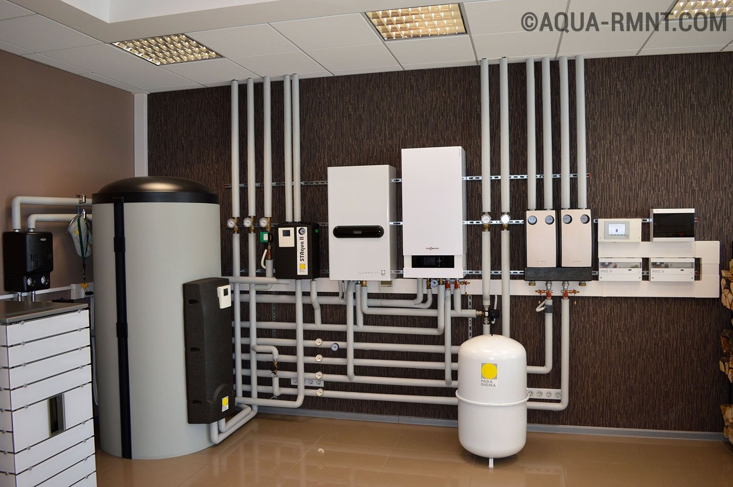 - Éléments auxiliaires (pompes, collecteurs, vannes, dispositifs de contrôle, vase d'expansion, chaudière à accumulation de chaleur).