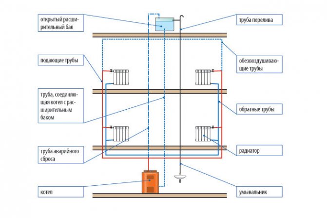 - Fiabilité du travail. La pression dans les conduites étant égale à la pression atmosphérique, l'excès de température est compensé à l'aide d'un vase d'expansion.