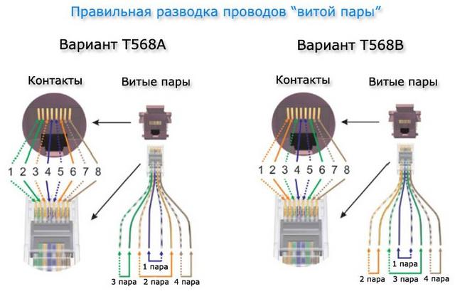 Lors de la connexion d'un câble Internet, deux schémas sont autorisés : T568A et T568B. Mais dans notre pays, les fils sont localisés principalement en utilisant le schéma «B».