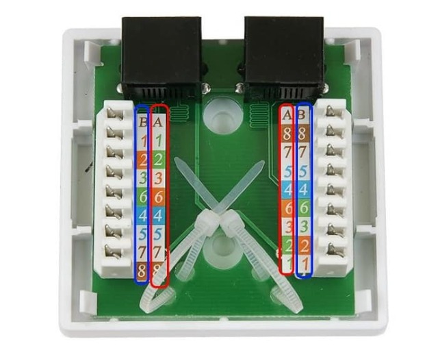 Presque tous les fabricants de prises informatiques placent un schéma de connexion à l'intérieur, indiquant l'ordre dans lequel les fils sont placés, en fonction de leurs couleurs. En règle générale, le schéma "A" et le schéma "B" sont indiqués.
