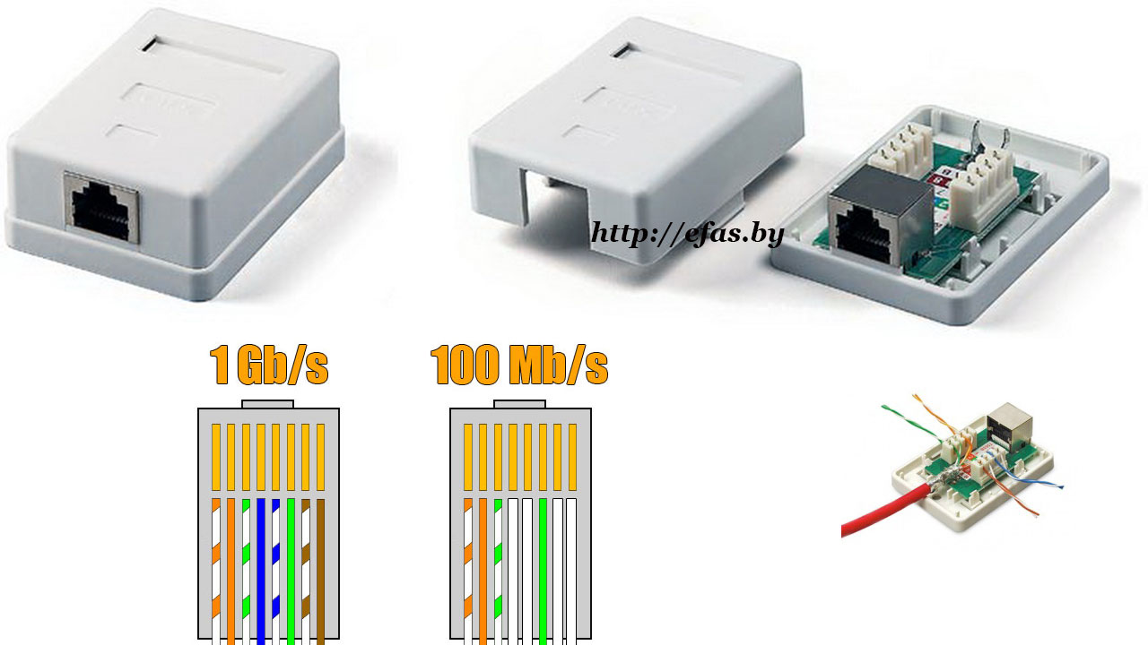 La principale différence entre une prise Internet et une prise électrique ordinaire est qu'elle possède son propre connecteur unique, qui est connecté à un type spécial de câblage appelé paire torsadée. Il est unique en ce qu'il contient 8 fils de cuivre individuels torsadés ensemble en 4 paires. Grâce à un tel système de connexion, les interférences électromagnétiques existantes sont nivelées, ce qui garantit finalement un taux de transfert de données élevé (jusqu'à 1000 Mbps).