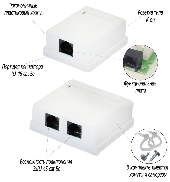 La technologie d'installation d'une double prise est similaire. La seule chose est que deux câbles devront être connectés à partir du routeur, car une connexion parallèle n'est pas utilisée pour les équipements réseau.