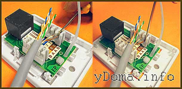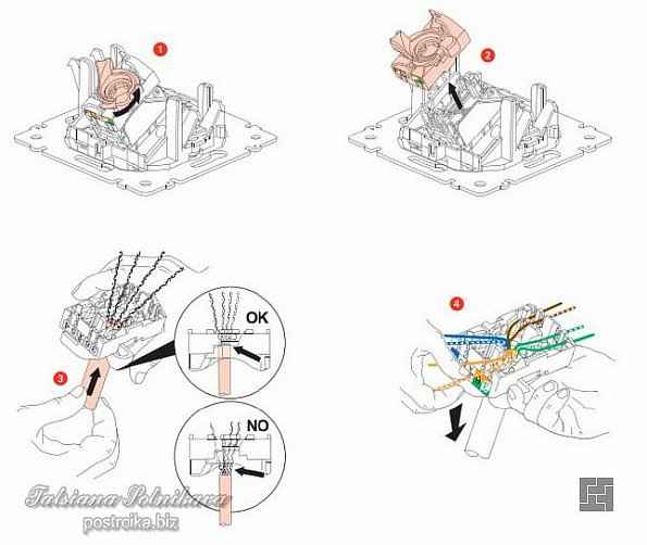 Au milieu se trouve une désignation avec la bonne connexion de fil. Le châssis doit être fixé au mur avec l'entrée de l'ordinateur vers le bas et l'entrée du câble vers le haut. A 5 cm, l'isolant est retiré de la paire torsadée. L'essentiel est de ne pas accrocher l'isolant des conducteurs.