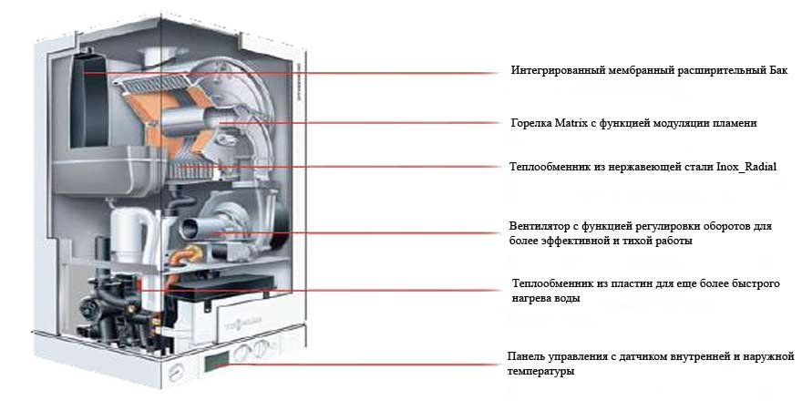 Avec le principe de fonctionnement du système de chauffage, il s'avère que la conception de la chaudière comporte deux échangeurs de chaleur: le principal et l'appoint (ou secondaire). L'unité principale fonctionne normalement et est chauffée par le gaz utilisé. La majeure partie de la chaleur est générée dans cet échangeur de chaleur. Quant au second - un échangeur de chaleur supplémentaire, il fonctionne sur l'énergie de la vapeur d'air qui se condense sur l'équipement.