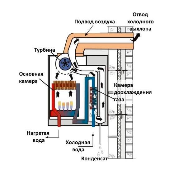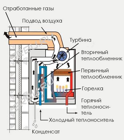 Une chaudière classique libère des produits de combustion assez chauds dans la cheminée. La température des gaz de combustion varie de 150 à 250 degrés. Le condenseur, après avoir élaboré le processus principal de transfert de chaleur, refroidit les produits gazeux de la combustion jusqu'à ce qu'un changement d'état d'agrégation commence à se produire. C'est-à-dire avant le début du processus de condensation. De ce fait, la chaudière augmente la partie utile de la chaleur transférée au liquide de refroidissement chauffé. Et ça le fait deux fois :