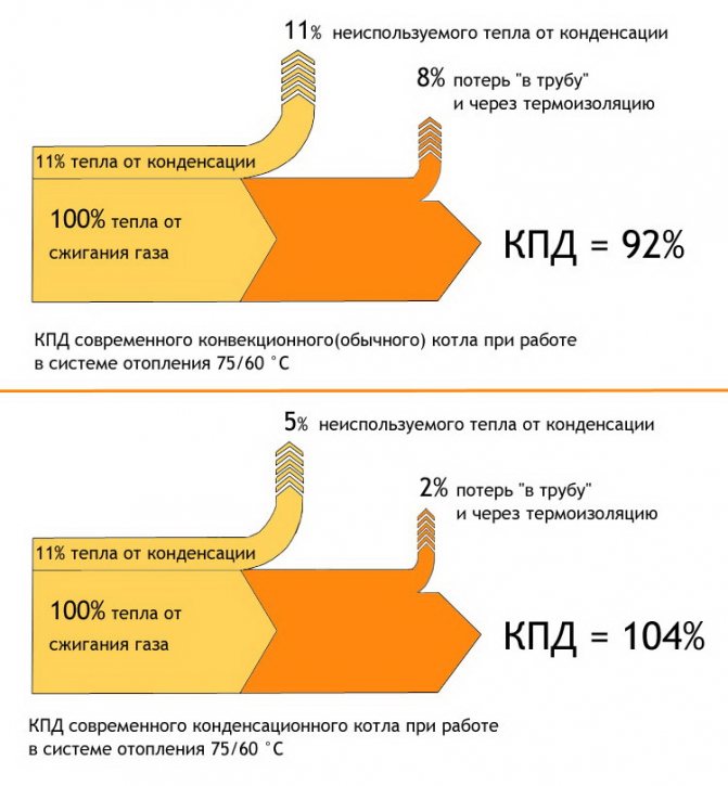 Souvent, lors de l'évaluation de l'efficacité des chaudières de chauffage, ils calculent quelle partie de la chaleur dégagée est transférée au liquide de refroidissement. La chaleur « prélevée » dans une chaudière conventionnelle et la chaleur provenant du refroidissement profond des gaz de combustion donneront un rendement total de 100 %. Mais si on ajoute ici la chaleur dégagée lors de la condensation de la vapeur, on obtient ~108-110%.