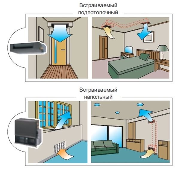 Si l'échange d'air est faible, faites attention aux modèles de climatiseurs de soufflage. Pour les pièces avec de hauts plafonds, tous les modèles intégrés conviennent - canal, cassette