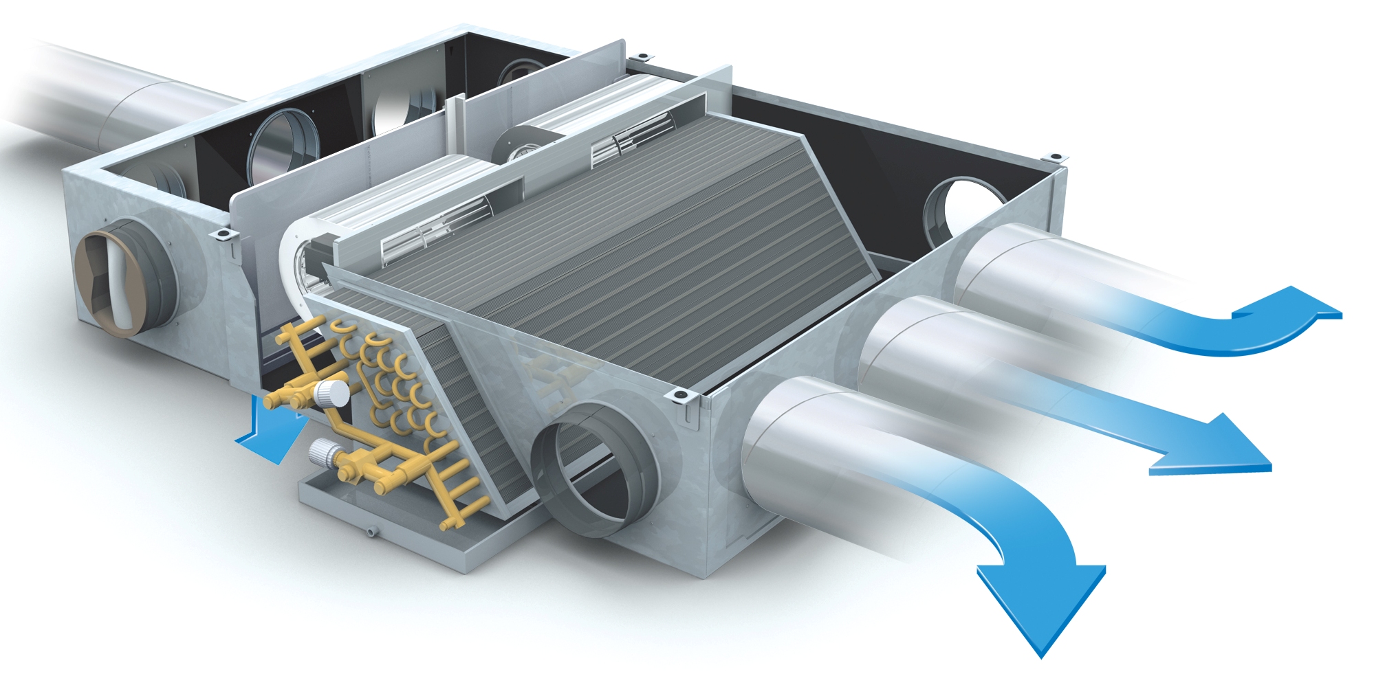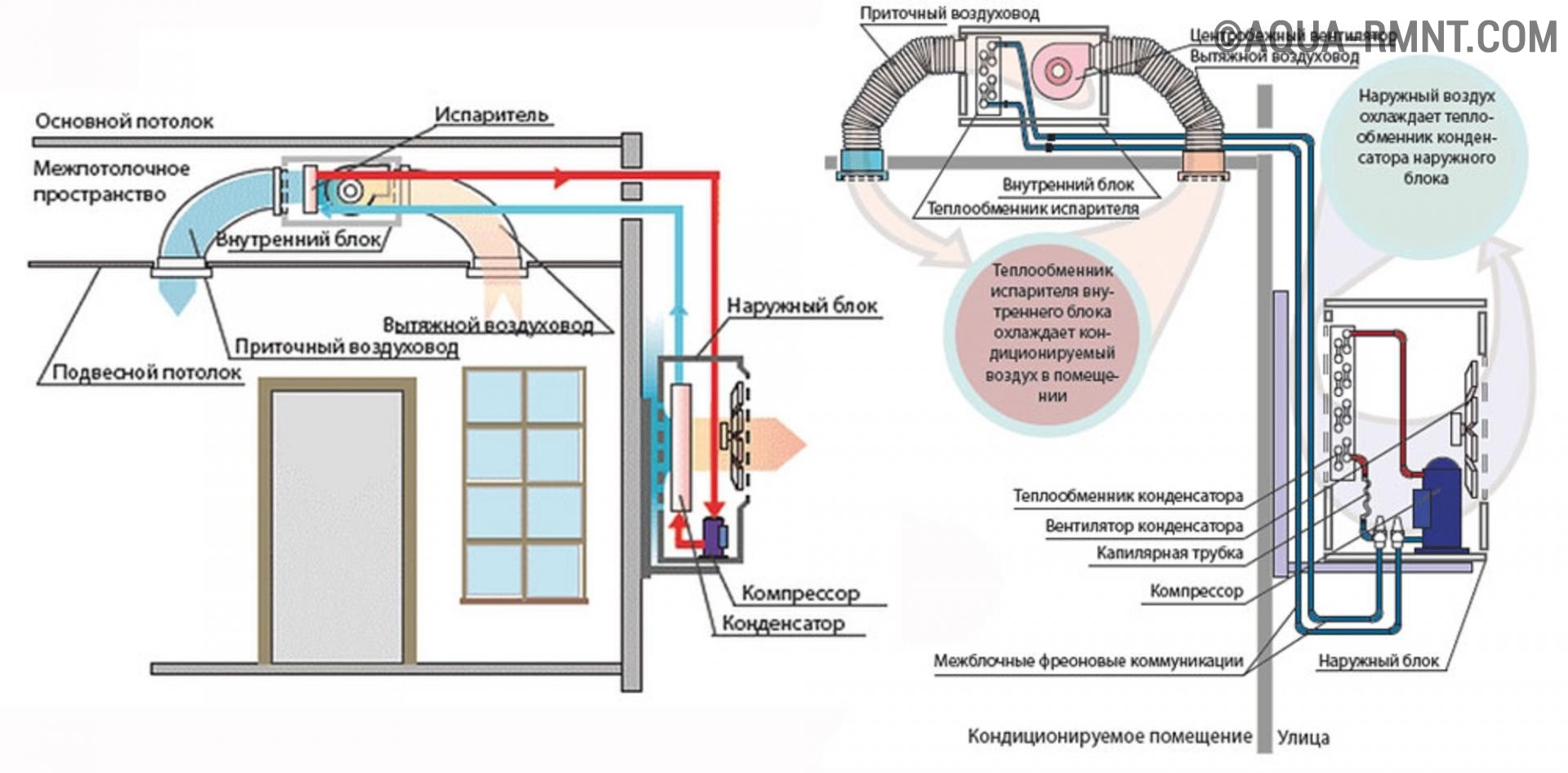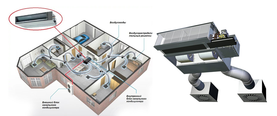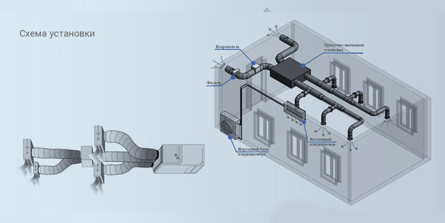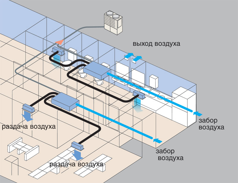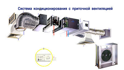 La partie extérieure de l'unité de conditionnement d'air prend l'air de la rue, puis il est pompé vers l'unité intérieure à l'aide du conduit d'air. En cours de route, un refroidissement ou un chauffage des masses d'air peut être effectué. Le schéma standard tient compte du fait que la distribution de l'air le long des autoroutes ne peut pas être créée par gravité. L'efficacité suffisante de ce système est assurée par l'utilisation de ventilateurs de grande puissance. Le refroidissement de l'air est réalisé par la partie d'échange de chaleur de l'évaporateur.