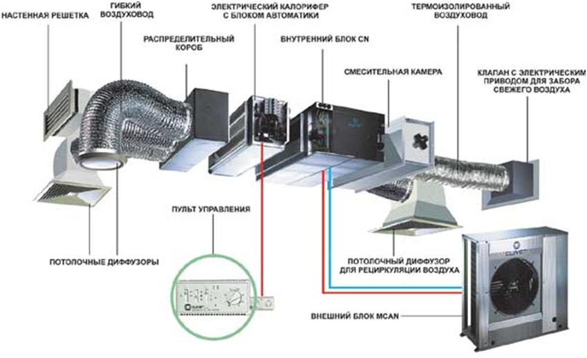 Le schéma de conception d'un climatiseur à gaine, qui remplit les fonctions de ventilation et de contrôle de la température à l'intérieur de la pièce. Un élément structurel obligatoire est un réchauffeur intégré dans le tuyau (+)