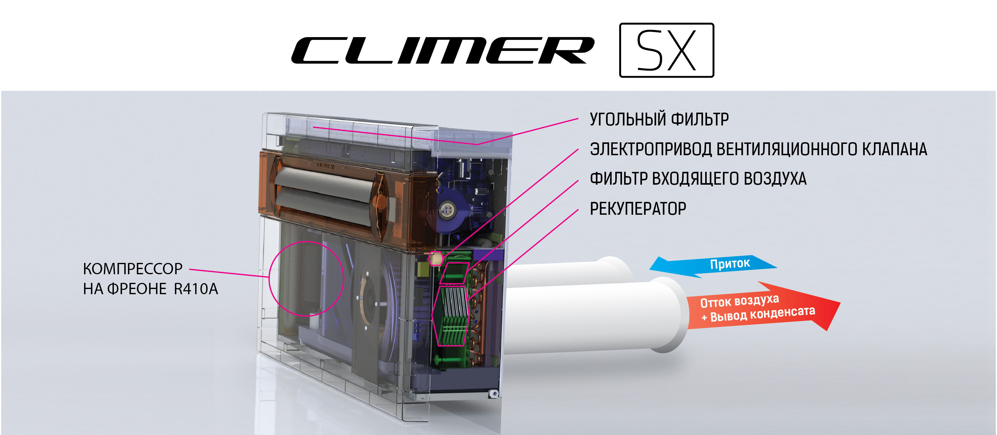 Le principe de fonctionnement du climatiseur est simple. Par les grilles d'admission, l'air ambiant pénètre dans l'unité, où il est refroidi, puis évacué par les conduits d'air vers l'extérieur. Le changement de température de l'air ne repose pas sur la production de froid, mais sur le transfert d'énergie thermique.