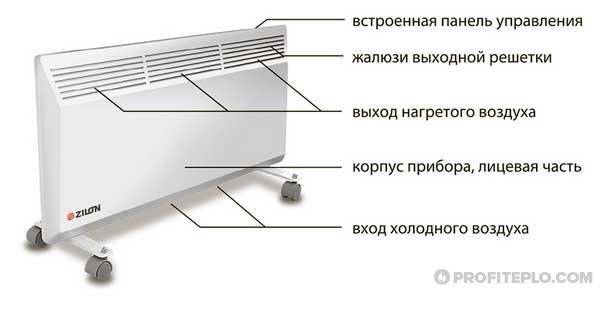 Le principe de fonctionnement de l'appareil est basé sur la capacité de l'air à se réchauffer sous l'influence de la convection naturelle. L'air de la pièce pénètre dans l'équipement, se réchauffe à une température confortable et pénètre à l'extérieur. Le flux d'air remplit tout le volume de la pièce grâce à des processus naturels.