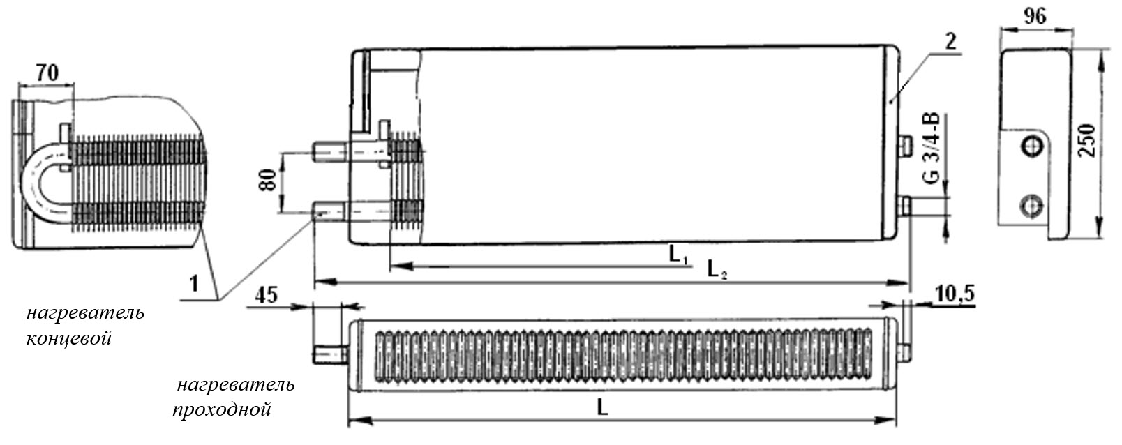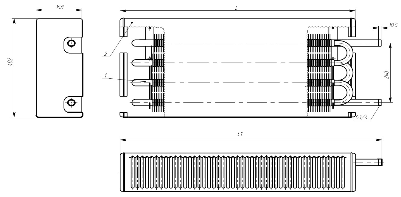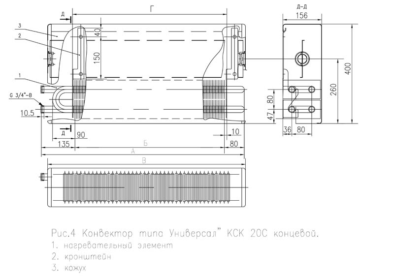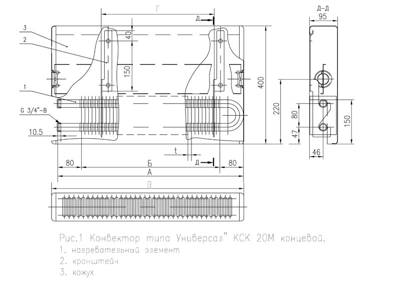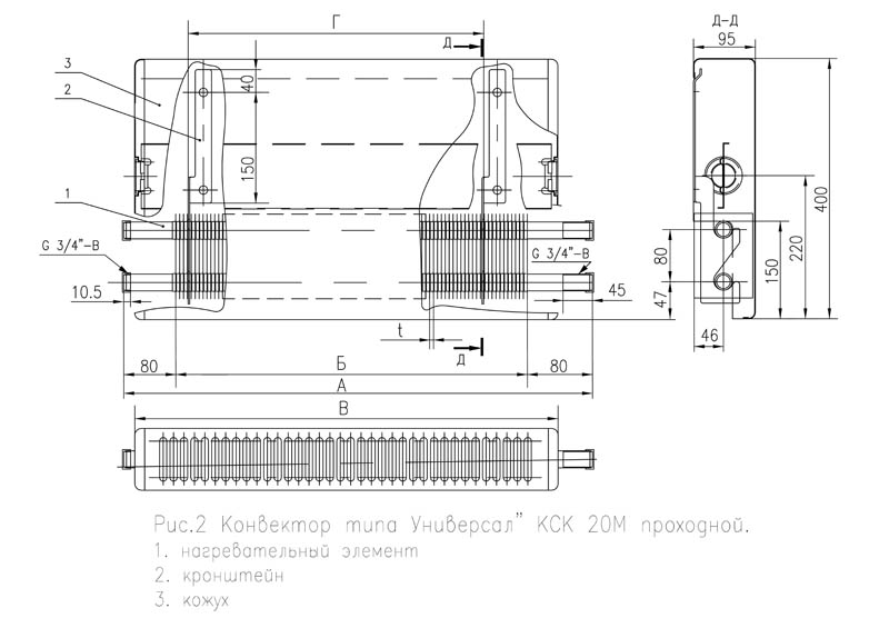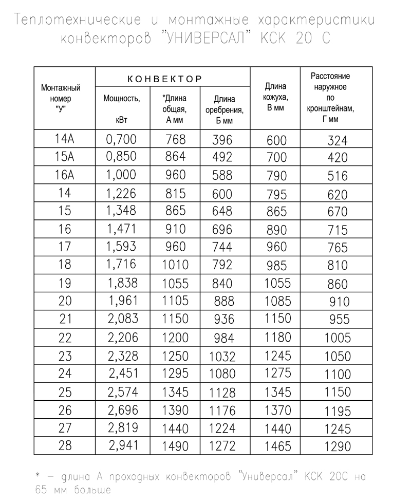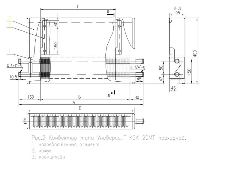 1.2 Les principaux paramètres et dimensions des convecteurs KSK-20 sont conformes à la norme interétatique GOST-20849-94 : hauteur 400 mm, profondeur 96 mm, densité linéaire du flux de chaleur nominal ne dépassant pas 1,5 kW/m, la gamme de produits est de 0,4 à 2,941 kW.