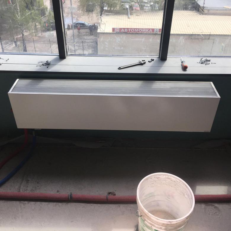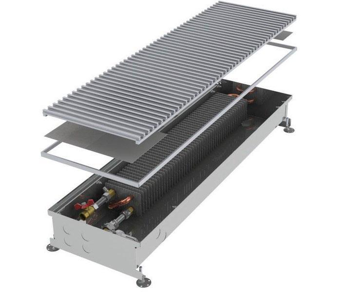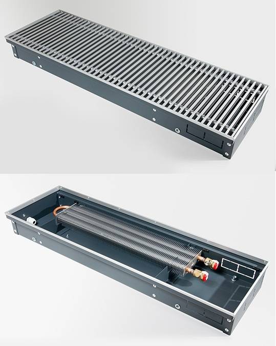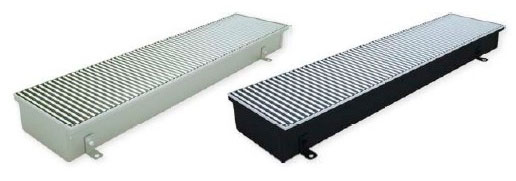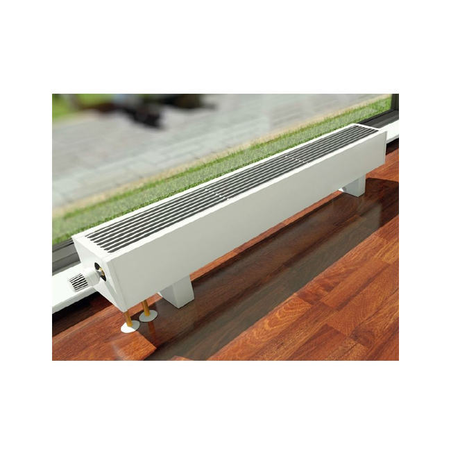 - Convecteur au sol avec ventilateur (PKOC, PKIOC, PKWOC). Il a une excellente dissipation thermique, il est rationnel de l'utiliser dans des pièces avec des pertes de chaleur importantes (halls, couloirs). Dimensions de 90 x 160 x 800 à 450 x 420 x 3000 millimètres.