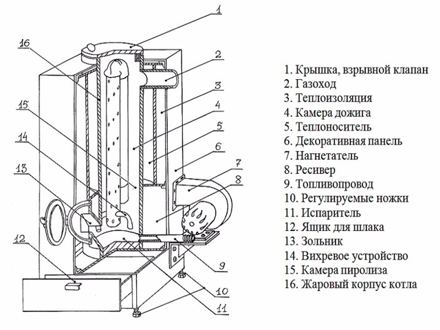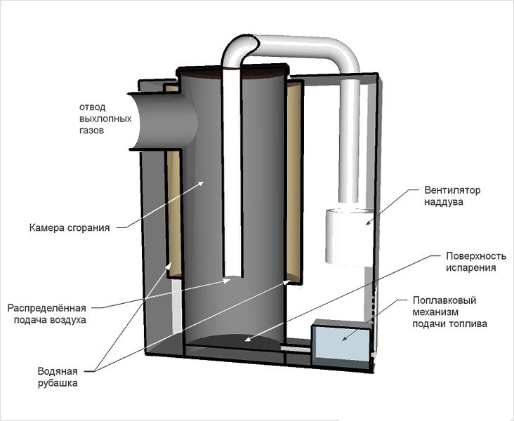 Le principe de fonctionnement est le suivant: le combustible doit être enflammé à l'aide d'un liquide inflammable, après quoi l'évaporation de l'exploitation minière et sa combustion primaire commenceront, provoquant une pyrolyse. Les gaz combustibles, pénétrant dans un tuyau perforé, s'enflamment au contact d'un courant d'oxygène et sont complètement brûlés. L'intensité de la flamme dans le foyer est régulée par un volet d'air.