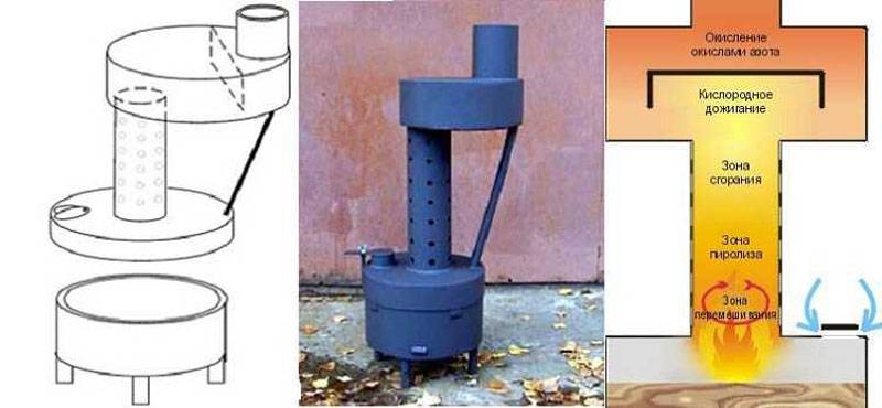 Pour mettre en œuvre ce principe dans la conception du poêle, deux chambres sont fournies, qui sont reliées entre elles par un tuyau percé de trous. Le carburant pénètre dans la chambre inférieure par le trou de remplissage, qui est chauffé ici. Les substances volatiles résultantes montent dans le tuyau, étant saturées d'oxygène atmosphérique à travers la perforation.