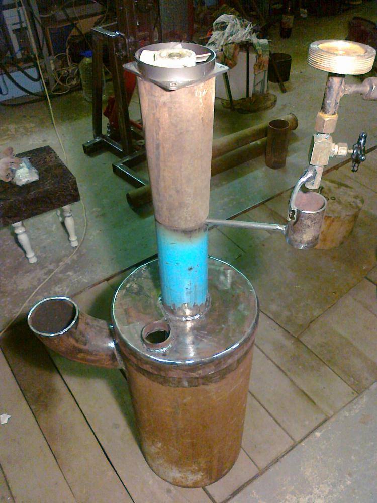 1. Deux trous sont percés tangentiellement dans le cylindre : par le bas (pour l'entrée d'un mélange d'air et d'huile), et par le haut pour la sortie de la flamme. Tuyaux soudés d'un diamètre de 1,5 pouces. L'un est la continuation de l'autre, seulement un peu plus haut ; de sorte que le feu tourbillonne à l'intérieur et ne s'envole pas immédiatement dans la rue.