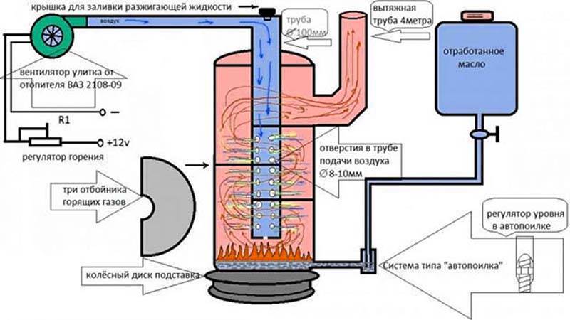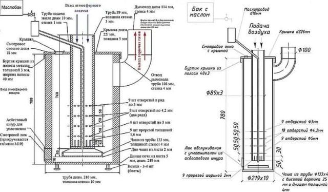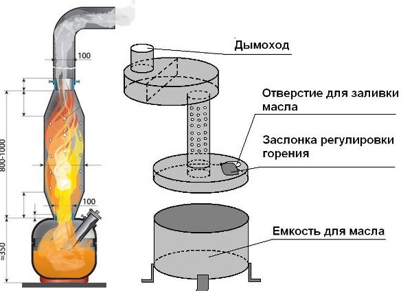 Le four est de forme ronde, soudé à partir d'une tôle d'acier. Le réservoir de carburant est combiné avec la chambre de combustion.La post-combustion est un tuyau perforé et une chambre supérieure équipée d'une paroi de séparation qui traverse la flamme. Un trou est découpé dans le couvercle de la chambre inférieure, où l'exploitation minière est versée, l'air y circulera également. Le principe est le suivant : plus le registre est ouvert, mieux l'huile brûlera.