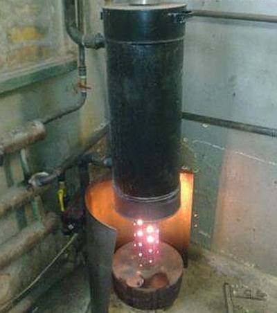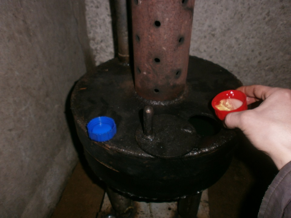 À partir de l'extrémité inférieure, le tuyau perforé est fermé par un bouchon, où 4 trous sont percés - un au milieu, les trois autres - radialement. Un tuyau d'huile est conduit dans le trou central et ébouillanté. La dernière étape est la fabrication d'un bol ardent de la chaudière, où l'huile usée brûlera.