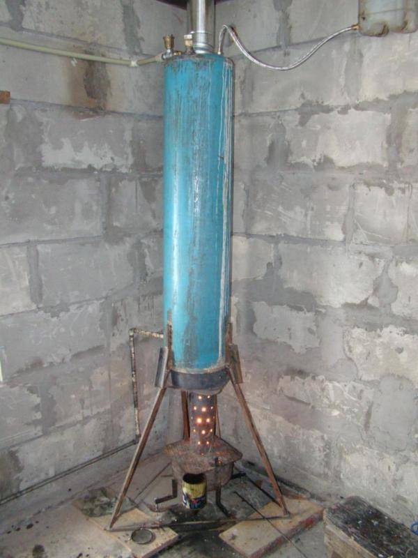 Un modèle pratique d'une chaudière minière avec un circuit d'eau à partir d'une bouteille de gaz avec un dessus de coupure. Ici, vous pouvez fournir un approvisionnement automatisé de l'exploitation minière. La conduite d'huile est située dans la chambre de combustion. Le circuit d'eau ressemble à une chaudière à travers laquelle passe un canal de cheminée. Ou il peut s'agir d'un échangeur de chaleur à serpentin en cuivre, qui est enroulé autour du corps du four.