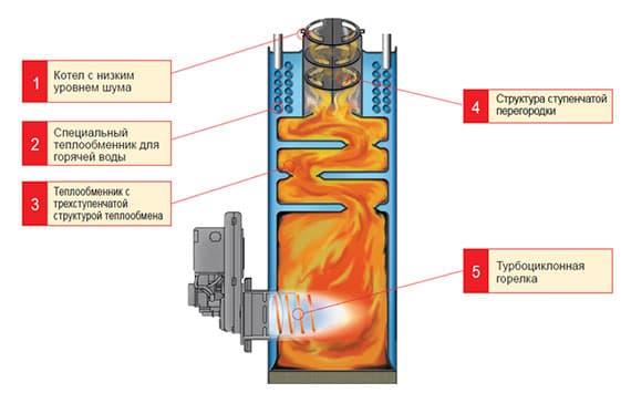 En fait, le dispositif le plus important d'une chaudière diesel est son brûleur soufflant. Il pompe et régule le débit d'air, et donc l'oxygène dans le four. Le brûleur contrôle la quantité de carburant fournie à la chambre de combustion. L'air pulsé garantit la combustion complète du combustible, ce qui assure le haut rendement d'une telle chaudière.