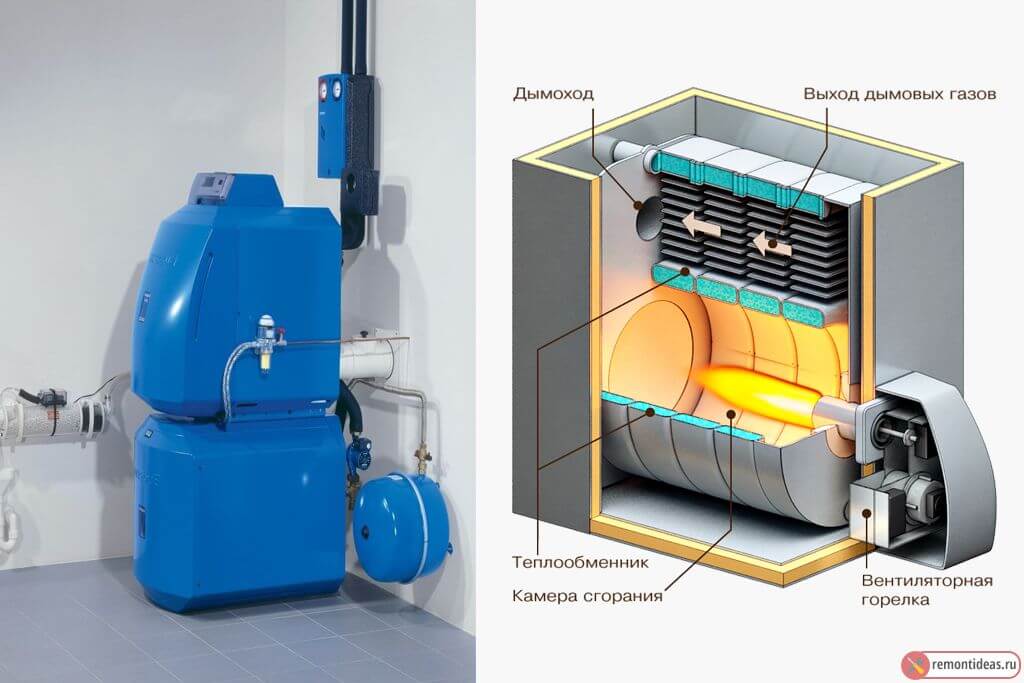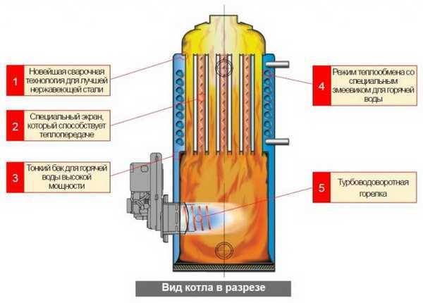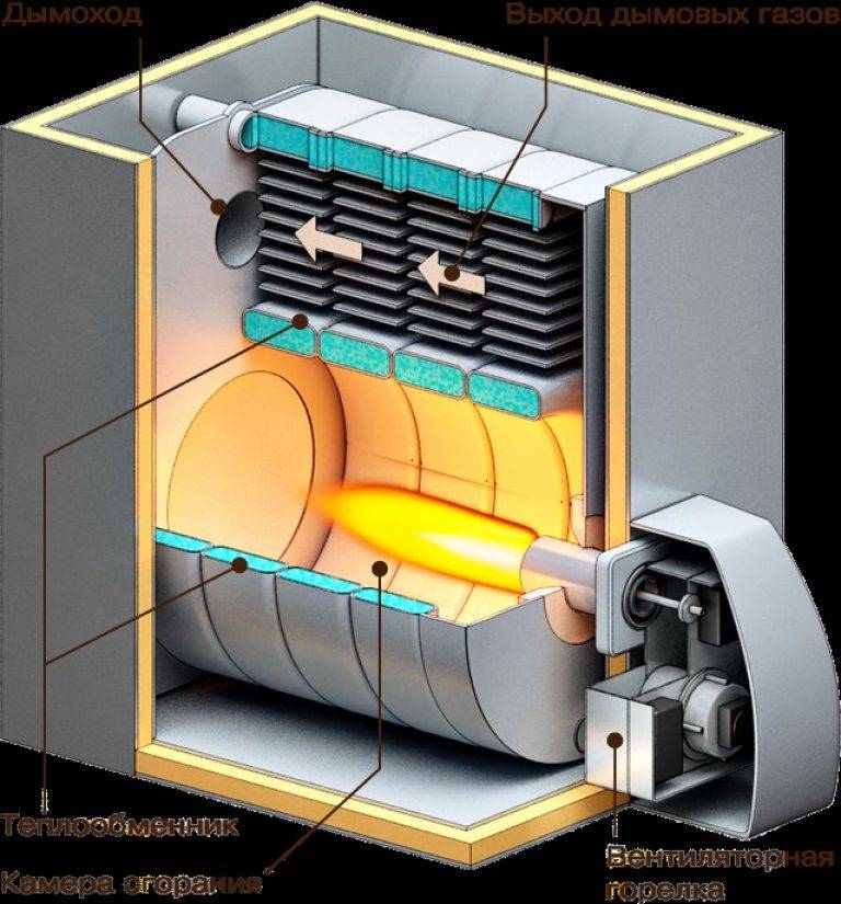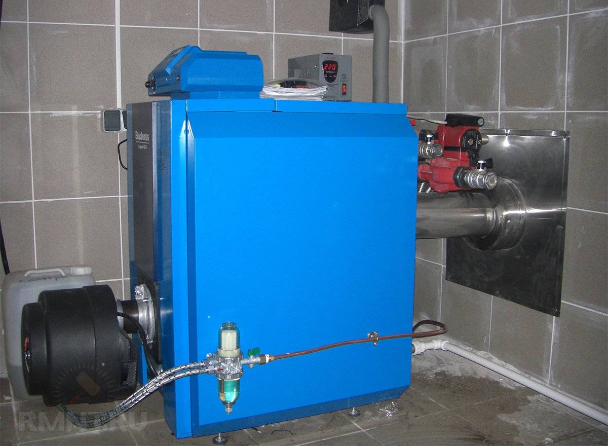 Les chaudières diesel modernes pour les chalets et les chalets sont fabriquées sous la forme d'une structure de plancher. Ce qui permet non seulement de chauffer de l'eau pour le système de chauffage, mais également de transmettre de la chaleur à travers ses parois à la chaufferie.