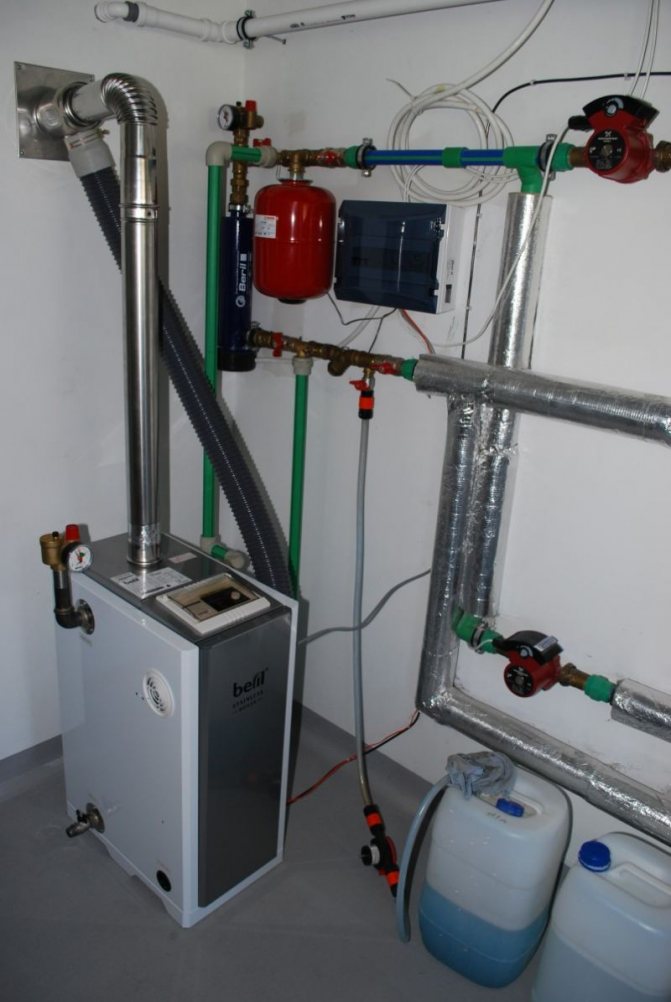 Si le chauffage de l'eau est fourni, la tuyauterie peut être réalisée après l'installation d'une chaudière diesel et d'un réservoir de liquide de refroidissement au lieu de pierres.