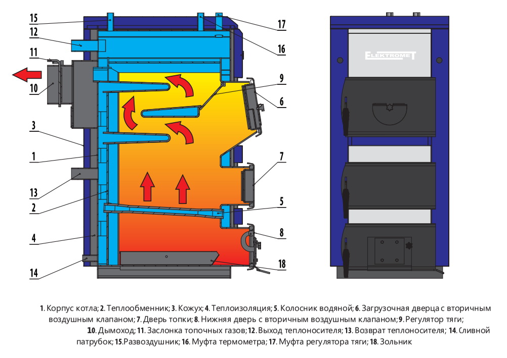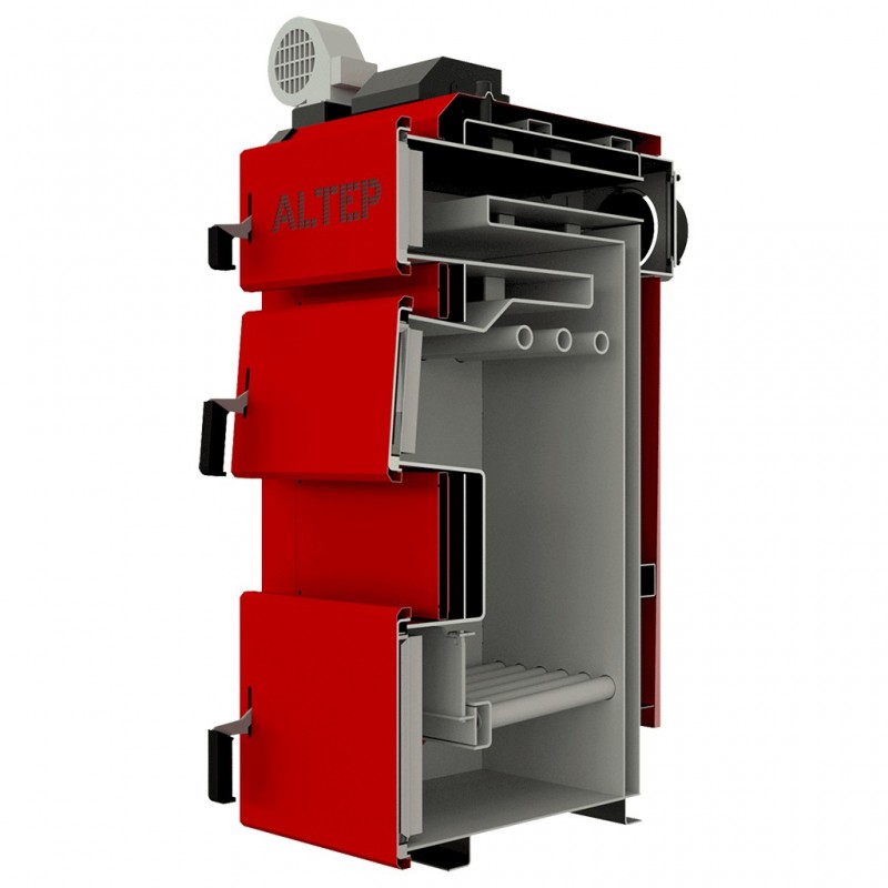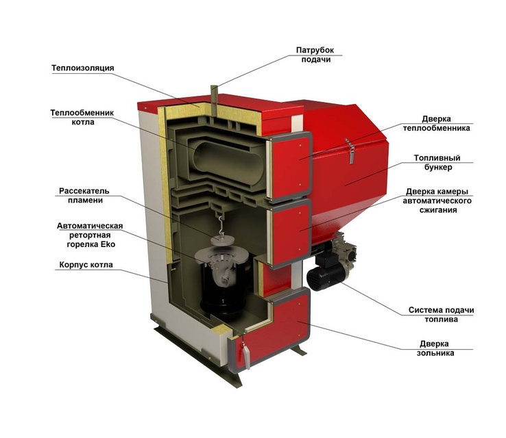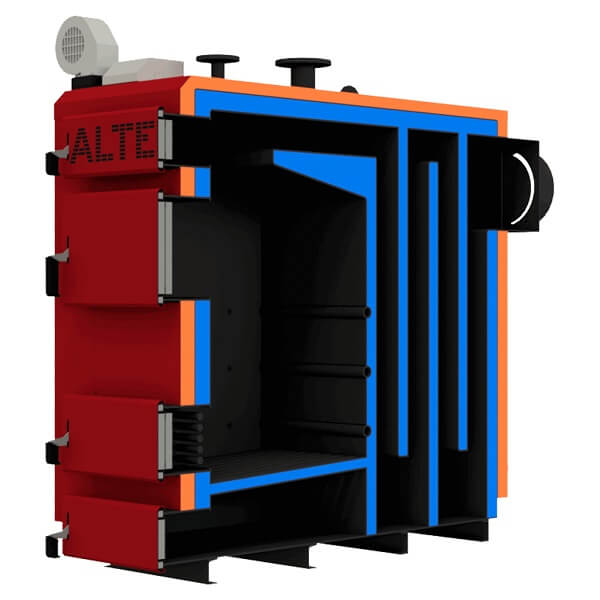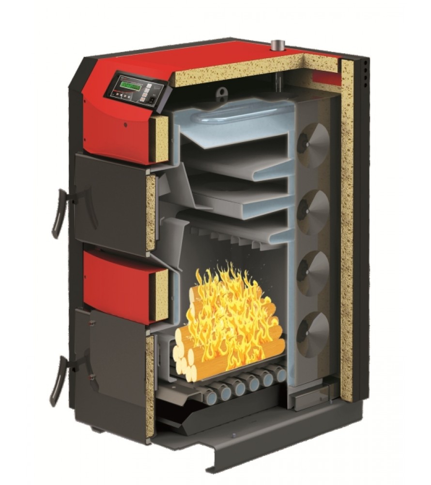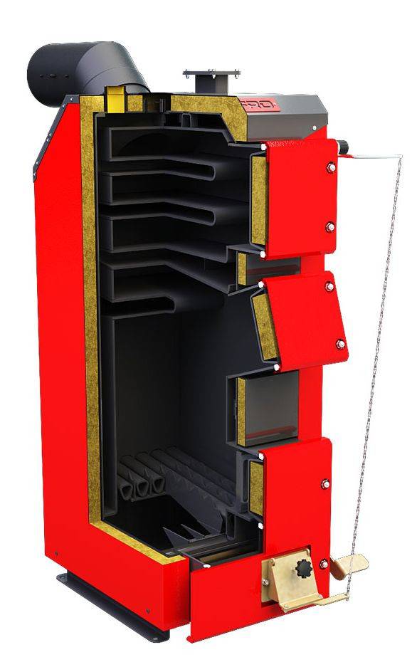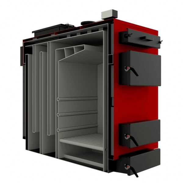 Le corps de la chaudière est isolé avec une couche de laine de verre, ce qui minimise les pertes de chaleur et économise du combustible. L'échangeur de chaleur lui-même est en fonte, comporte trois sections, grâce auxquelles il y a une combustion équilibrée de tout le carburant sans résidu. Cela réduit considérablement l'émission de gaz nocifs dans l'atmosphère. L'intensité de la combustion du carburant est régulée par un dispositif qui ouvre légèrement la porte et laisse passer un peu d'air à l'intérieur. De larges portes permettent un chargement pratique et sûr du combustible dans la chaudière, tout en facilitant grandement son nettoyage.