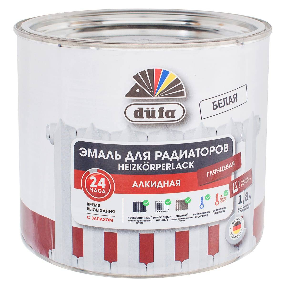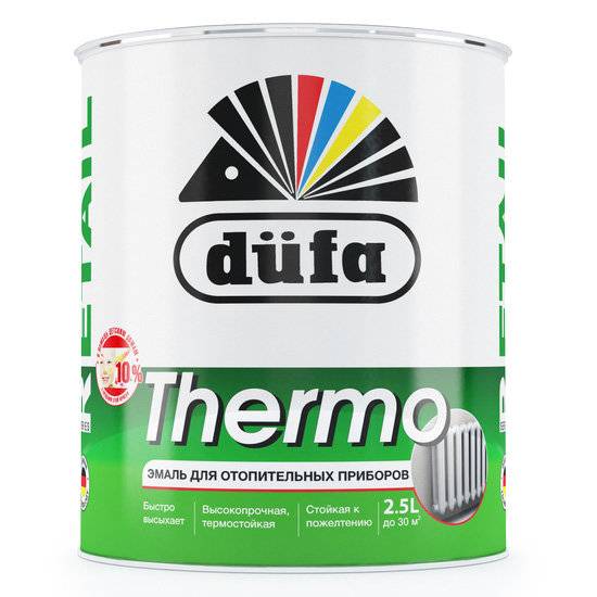 Fabriqué dans une large gamme de couleurs. Les inconvénients incluent un prix assez élevé. Par exemple, la peinture pour systèmes de chauffage Dufa Heizkorperlack dans un emballage de 2,5 kg coûte de 1500 à 1680 roubles. De plus, les émaux alkydes s'estompent avec le temps, peuvent se couvrir de petites fissures et, pendant les 3 à 5 premiers jours suivant l'application, ils dégagent une odeur forte et désagréable.